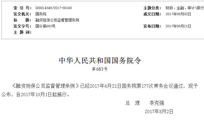 為了規(guī)范融資擔保公司的行為,防范風險,2017年8月2日,國務院總理李克強簽署國務院令683號,公布《融資擔保公司監(jiān)督管理條例》(以下簡稱條例),自2017年10月1日起施行。