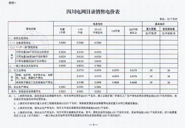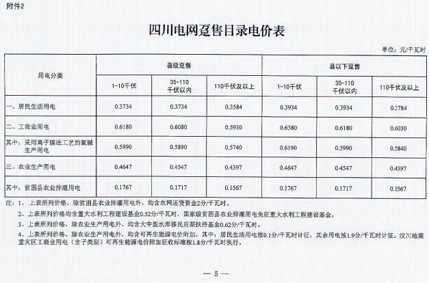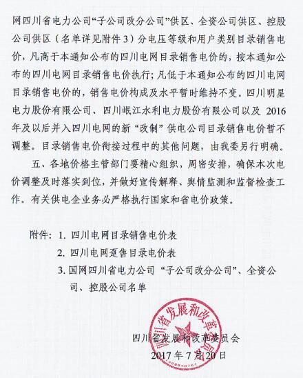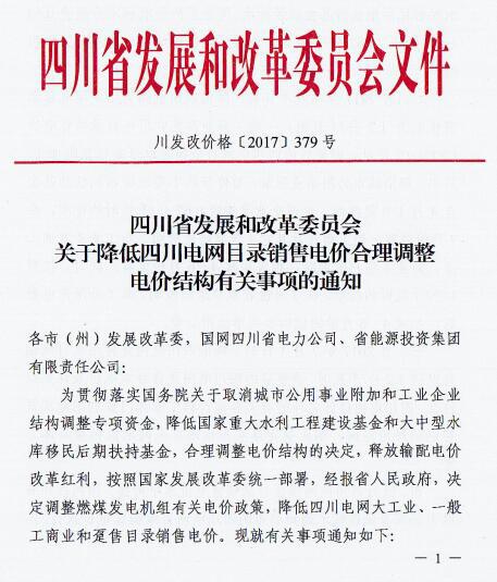近日,四川省發(fā) 改 委發(fā)布了《四川省發(fā)展和改革委員會關(guān)于降低四川電網(wǎng)目錄銷售電價合理調(diào)整電價結(jié)構(gòu)有關(guān)事項的通知》(以下簡稱“通知”)。通知指出,自2017年7月1日起,取消向燃煤發(fā)電企業(yè)征收工業(yè)企業(yè)結(jié)構(gòu)調(diào)整專項資金,降低重大水利工程建設(shè)基金和中大型水庫移民后期扶持基金征收標(biāo)準(zhǔn),降低后的征收標(biāo)準(zhǔn)分別為0.52分/千瓦時、0.62分/千瓦時。燃煤發(fā)電機(jī)組有關(guān)電價政策另行明確。具體情況如下:
