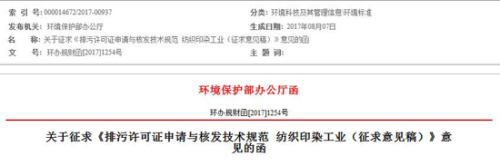 關(guān)于征求《排污許可證申請(qǐng)與核發(fā)技術(shù)規(guī)范紡織印染工業(yè)(征求意見(jiàn)稿)》意見(jiàn)的函