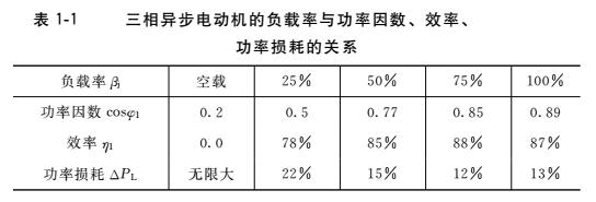 三相異步電動機(jī)的負(fù)載率與功率因數(shù)、效率、功率損耗的關(guān)系見表1-1。