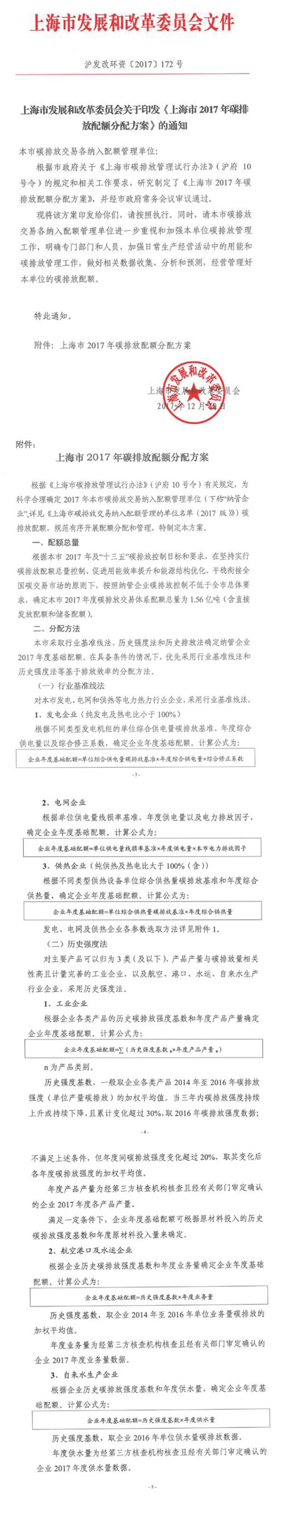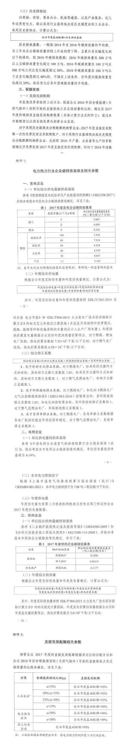 近日,上海市發(fā)改 委印發(fā)了《上海市2017年碳排放配額分配方案》, 方案中確定了上海市2017度碳排放交易體系配額總量為1.56億噸(含直接發(fā)放配額和儲(chǔ)備配額)。上海市采取行業(yè)基準(zhǔn)線法、歷史強(qiáng)度法和歷史排放法確定納管企業(yè)2017年度基礎(chǔ)配額。在具備條件的情況下,優(yōu)先采用行業(yè)基準(zhǔn)線法和歷史強(qiáng)度法等基于排放效率的分配方法。發(fā)電企業(yè):根據(jù)不同類型發(fā)電機(jī)組的單位綜合供電量碳排放基準(zhǔn)、年度綜合供電量以及綜合修正系數(shù),確定企業(yè)年度基礎(chǔ)配額。電網(wǎng)企業(yè):根據(jù)單位供電量線損率基準(zhǔn)、年度供電量以及電子排放因子,確定企業(yè)年度基礎(chǔ)配額。