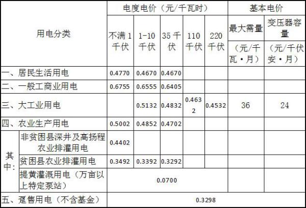 注:1、上表所列價格,除貧困縣農(nóng)業(yè)排灌用電、躉售用電外,均含國家重大水利工程建設(shè)基金0.7分錢。