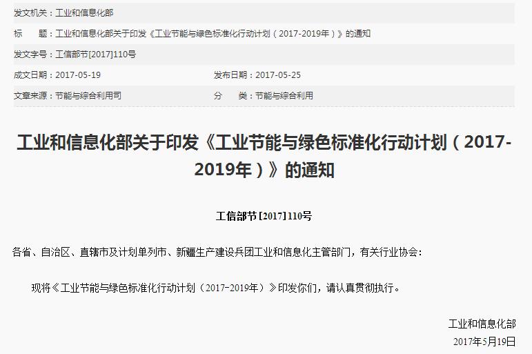 關(guān)于工信部印發(fā)《工業(yè)節(jié)能與綠色標(biāo)準(zhǔn)化行動(dòng)計(jì)劃(2017-2019年)》的通知