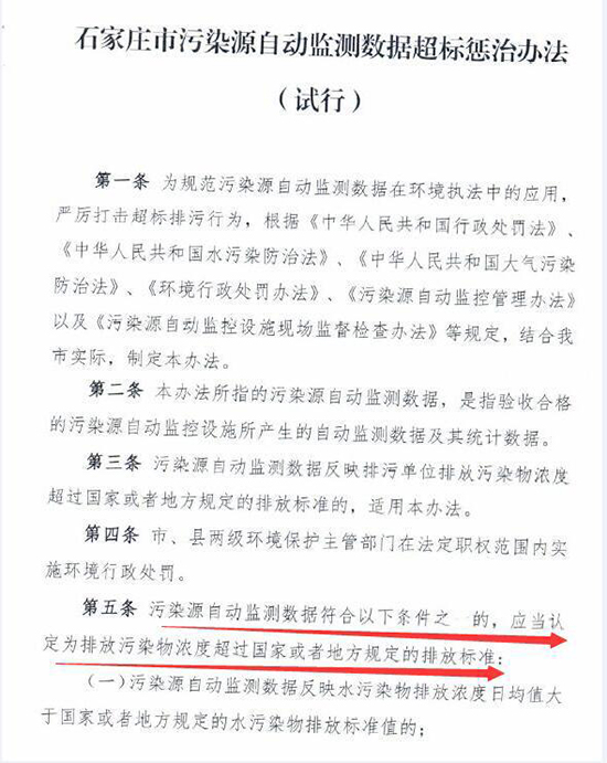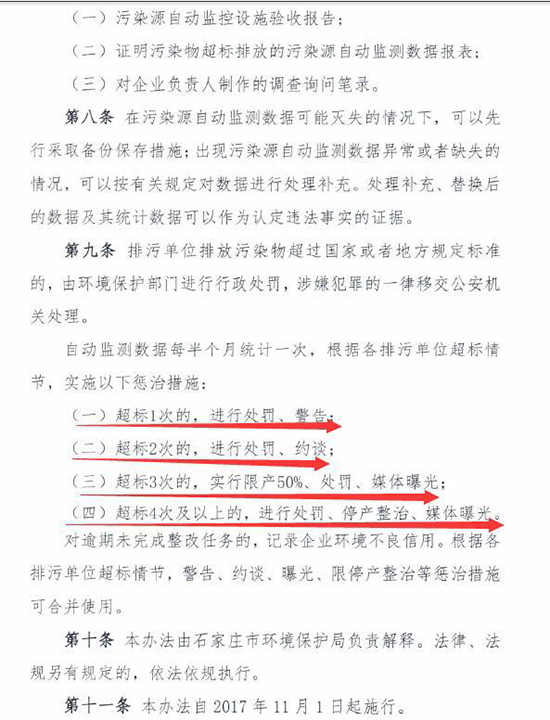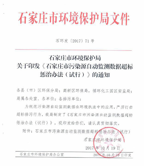 近日河北石家莊市環(huán)保局印發(fā)《石家莊市污染源自動(dòng)監(jiān)測(cè)數(shù)據(jù)超標(biāo)懲治辦法(試行)》(以下簡(jiǎn)稱“辦法”)。辦法明確,企業(yè)污染源自動(dòng)監(jiān)測(cè)數(shù)據(jù)出現(xiàn)超標(biāo)將被處罰,超標(biāo)4次及以上,將停產(chǎn)整治。辦法自11月1日起施行。