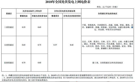 一、根據(jù)當前光伏產業(yè)技術進步和成本降低情況,降低2018年1月1日之后投運的光伏電站標桿上網電價,Ⅰ類、Ⅱ類、Ⅲ類資源區(qū)標桿上網電價分別調整為每千瓦時0.55元、0.65元、0.75元(含稅)。自2019年起,納入財政補貼年度規(guī)模管理的光伏發(fā)電項目全部按投運時間執(zhí)行對應的標桿電價。