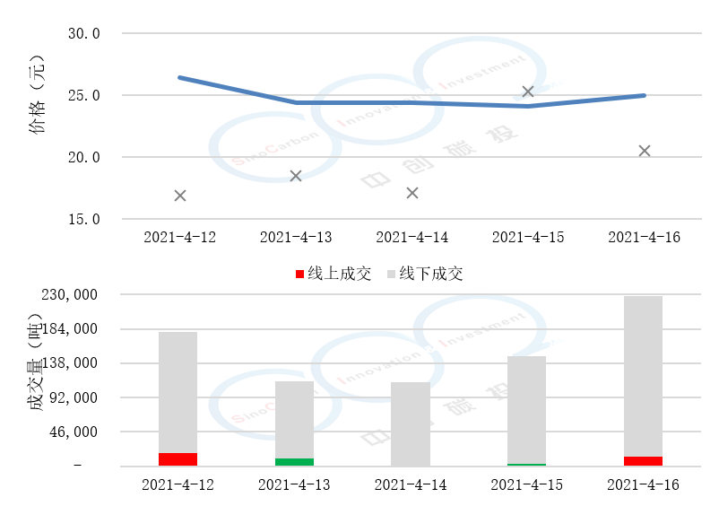 線上成交價(jià)最低為24.10元,最高為26.45元,平均碳價(jià)為24.87元。