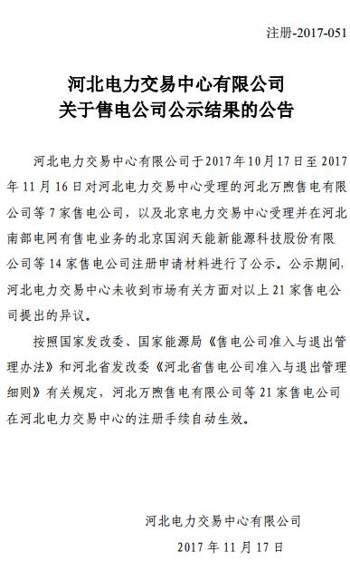 11月17日,河北電力交易中心發(fā)布了《關(guān)于售電公司公示結(jié)果的公告》,公告稱10月17日至11月16日,河北電力交易中心受理河北萬煦售電有限公司等7家售電公司,以及北京電力交易中心受理并在河北南部電網(wǎng)有售電業(yè)務(wù)的北京國潤天能新能源科技股份有限公司等14家售電公司注冊申請材料進(jìn)行了公示,公示期間未收到異議,這21家售電公司注冊手續(xù)自動生效。