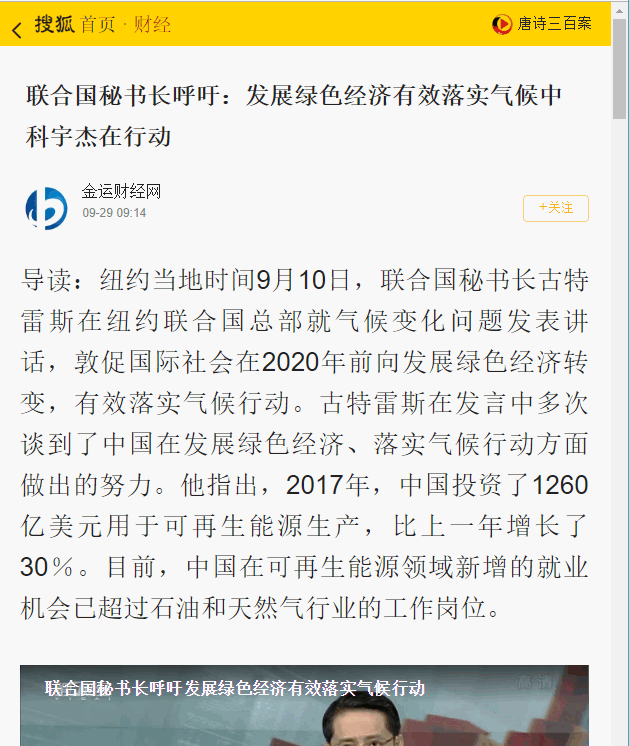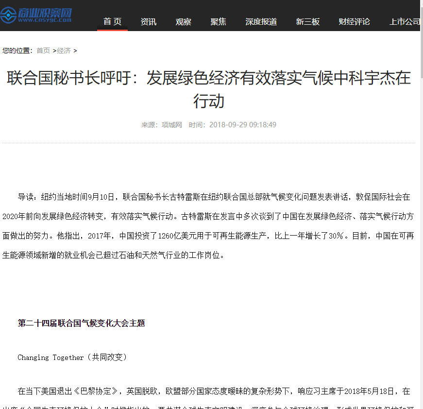 導(dǎo)讀:紐約當(dāng)?shù)貢r間9月10日,聯(lián)合國秘書長古特雷斯在紐約聯(lián)合國總部就氣候變化問題發(fā)表講話,敦促國際社會在2020年前向發(fā)展綠色經(jīng)濟(jì)轉(zhuǎn)變,有效落實氣候行動。古特雷斯在發(fā)言中多次談到了中國在發(fā)展綠色經(jīng)濟(jì)、落實氣候行動方面做出的努力。他指出,2017年,中國投資了1260億美元用于可再生能源生產(chǎn),比上一年增長了30%。目前,中國在可再生能源領(lǐng)域新增的就業(yè)機(jī)會已超過石油和天然氣行業(yè)的工作崗位。