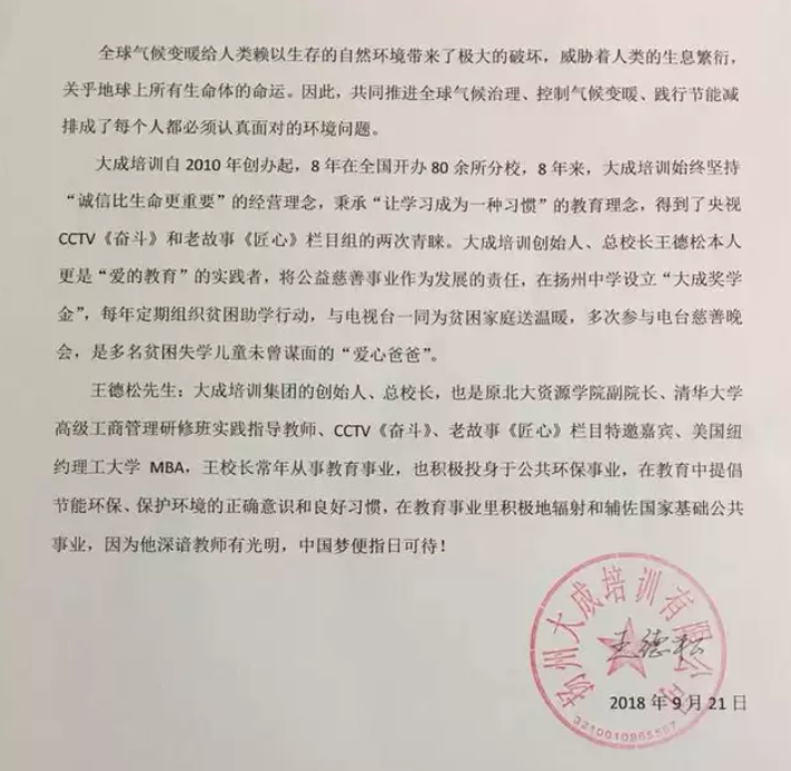 大成培訓(xùn)自2010年創(chuàng)辦起,至今在全國開辦80余所分校,8年來,大成培訓(xùn)始終堅持“誠信比生命更重要”的經(jīng)營理念,秉承“讓學(xué)習(xí)成為一種習(xí)慣”的教育理念,得到了央視CCTV《奮斗》和老故事《匠心》欄目組的兩次青睞。大成培訓(xùn)創(chuàng)始人、總校長王德松本人更是“愛的教育”的實踐者,將公益慈善事業(yè)作為發(fā)展的責(zé)任,在揚(yáng)州中學(xué)設(shè)立“大成獎學(xué)金”,8年從不間斷。每年定期組織貧困助學(xué)行動,多次參與電臺慈善晚會,與電視臺一同為貧困家庭送溫暖,是多名貧困失學(xué)兒童未曾謀面的“愛心爸爸”。